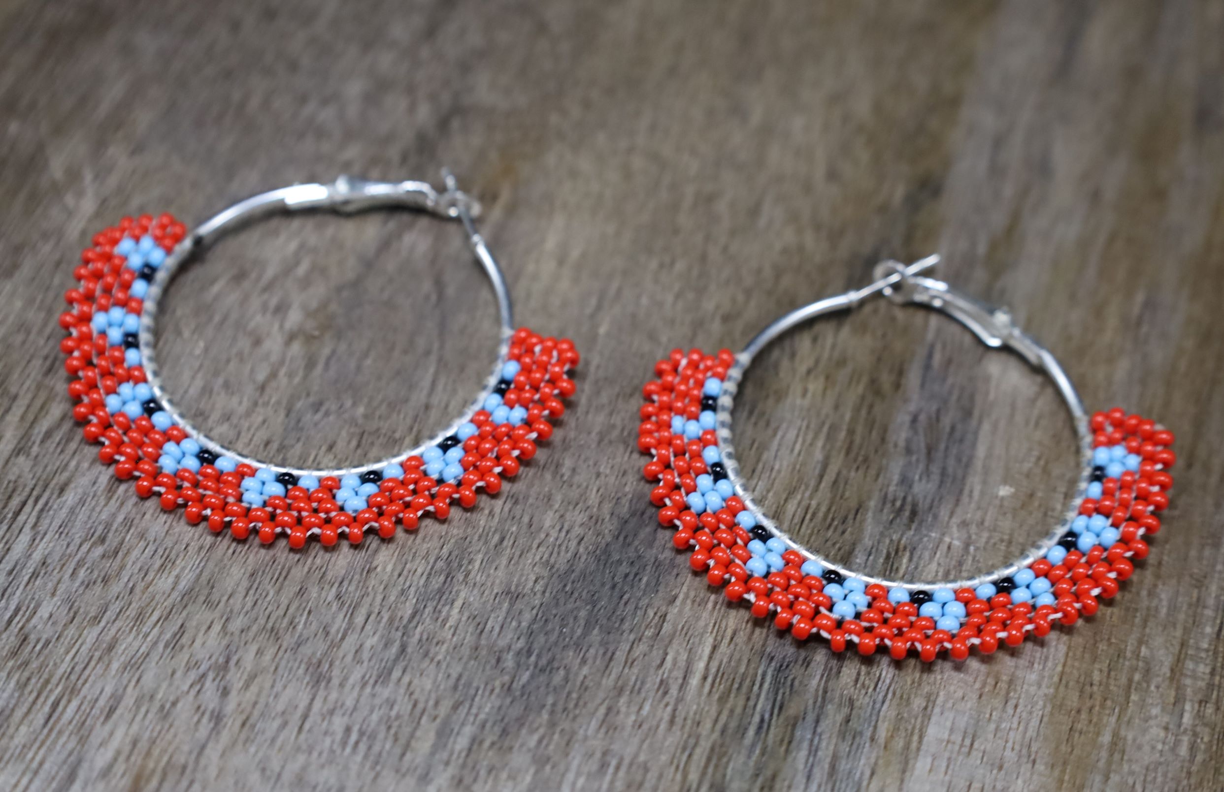 Handmade Beaded Fashion Earrings with Red and Blue Hoops