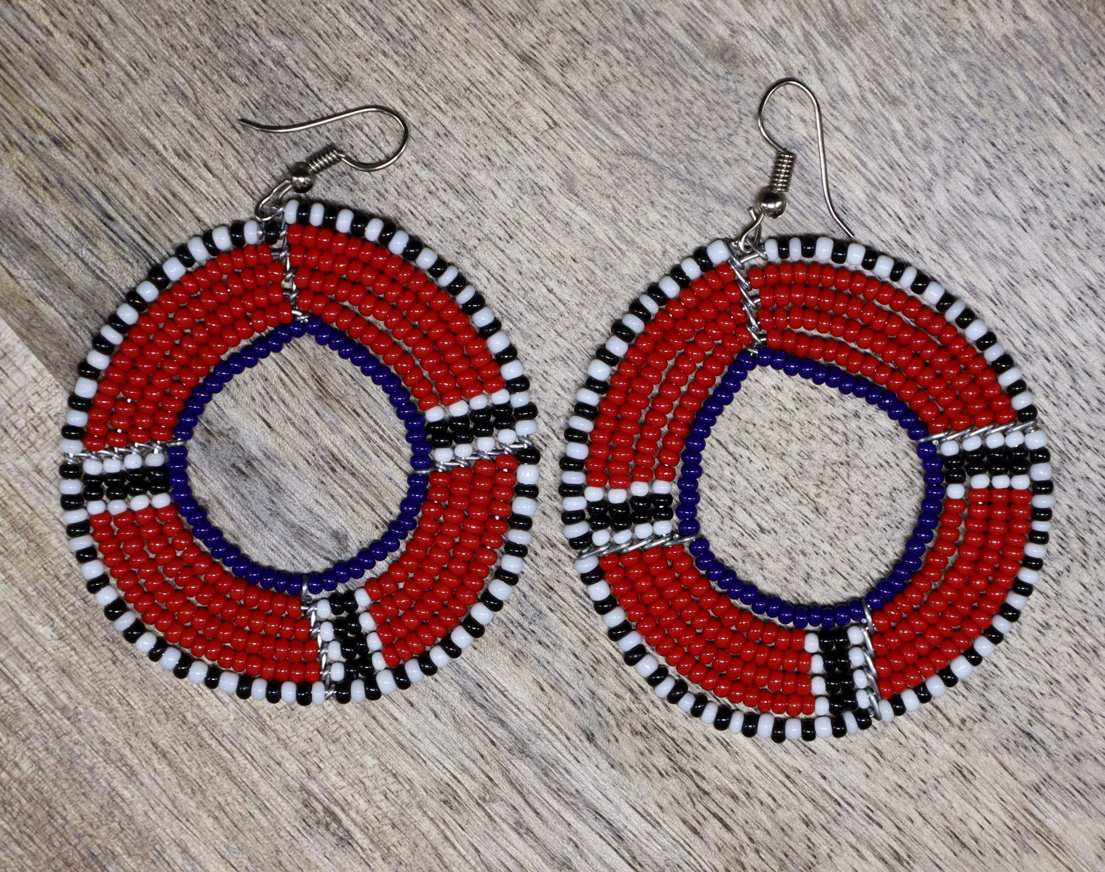 These beautiful, handcrafted red and blue hoops beaded earrings are made in Kisumu, Kenya by some amazing artisans. This intense color and complicated design of hoops-beaded earrings can bring a strong visual impact to people, so let’s try it now and show another side of your beauty. These beaded earrings are made of good quality AAA beads and handmade. The native seed beaded hoop earrings will not only a beautiful gift but also a strong expression of our best wishes. Every bead is well selected and threaded, every pair of long handmade seed bead dangle earrings are 100% handmade.